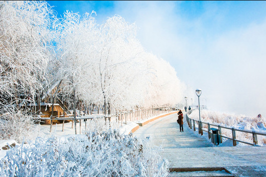 霧凇與桂林山水、雲南石林和長江三峽同為中國四大自然奇觀,而吉林霧淞卻是這四處自然景觀中最為特別的一個。被國內外遊人譽為人間絕景,吉林霧淞俗稱樹掛,隆冬時節,當北方無數條江河匍伏在冰層下喘息時,唯獨環繞吉林市區這段松花江水,約50公里,緩緩流淌,夜裡,江水濕潤,蒸騰的霧氣遇寒冷的空氣凝結於樹上。每當霧凇來臨,吉林松花江岸十裡長堤”忽如一夜春風來,千樹萬樹梨花開”。柳樹結銀花,松樹綻銀菊,把人們帶進如詩如畫的仙境。